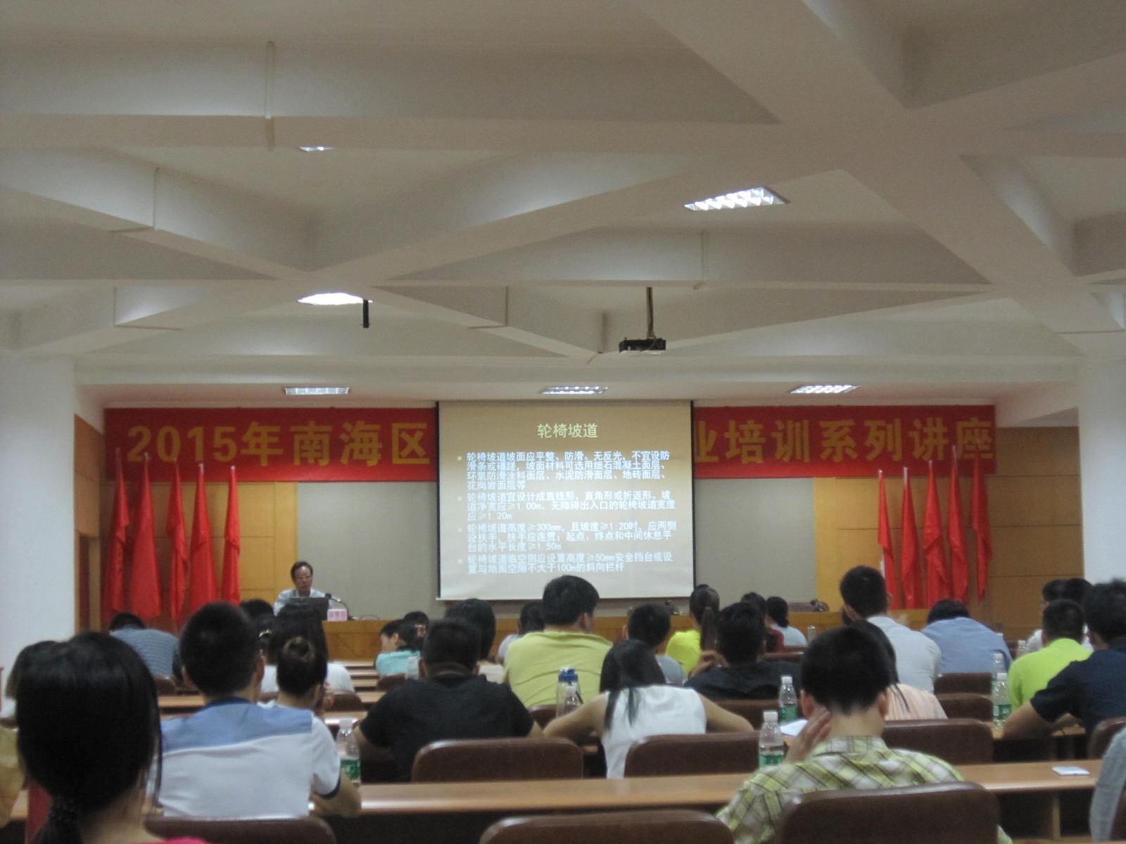 2015年8月13日上午,协会联合佛山市南海区国土城建和水务局在区局305会议室举办了《无障碍设计规范》宣贯培训班,参加培训的单位有来自勘察、设计、审图机构人员共128人,培训内容主要有《无障碍设计规范》GB50763-2012修订背景、依据及修订的理由;《无障碍设计规范》GB50763-2012强制性条文规定、要求及修订的主要内容解析;无障碍设计与案例分析(缘石坡道、轮椅坡道、轮椅席位、盲道、无障碍电梯、无障碍厕所、无障碍住房、无障碍浴室、无障碍标志、无障碍停车位、无障碍入口、建筑入口、门、通路、走道、地面、楼梯、台阶、扶手、升降平台、低位服务设施、过街音响信号装置等);无障碍设计文件审查要点、难点;无障碍设计疑难热点问题探讨与经验交流。培训达到了预期效果,气氛热烈。